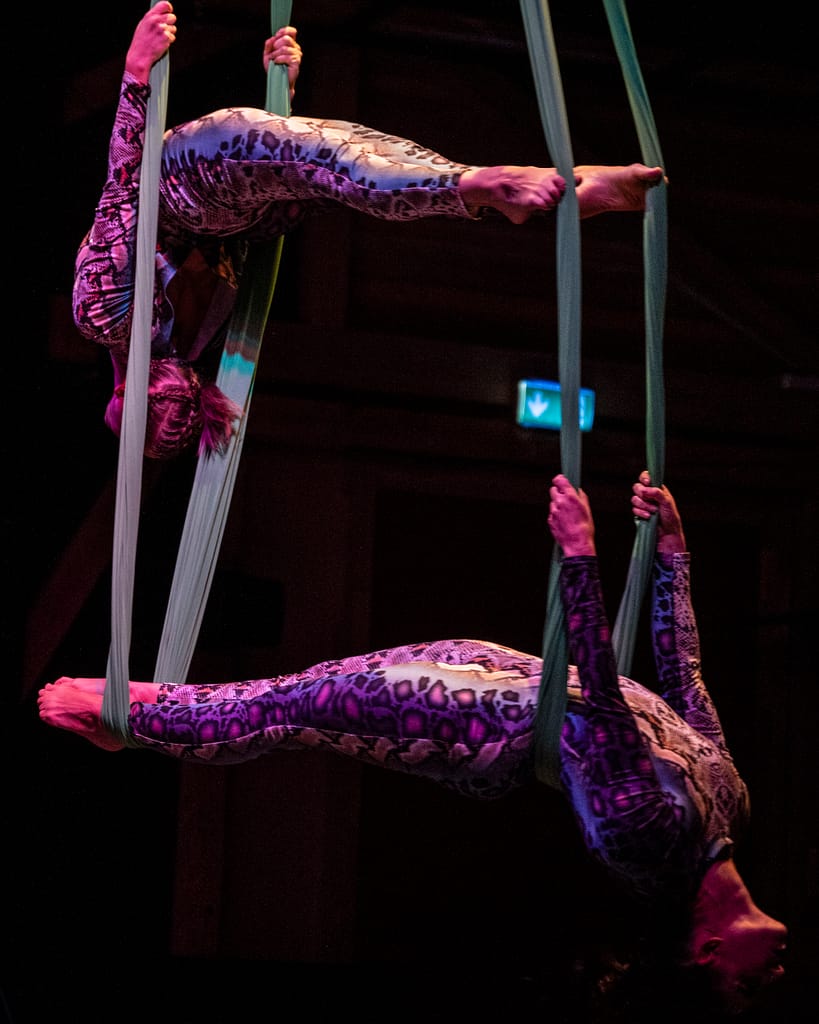 Discipline classique du cirque, le tissu consiste à réaliser des acrobaties sur deux pans de tissus verticaux. Pour développer ta force et ta souplesse sans même t’en rendre compte.