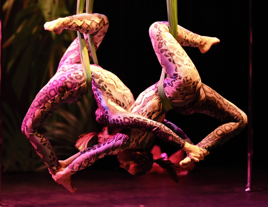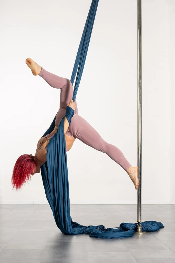 Deux pans de tissu accrochés à la barre, pour un mélange virevoltant, entre Pole acrobatique et hamac aérien.